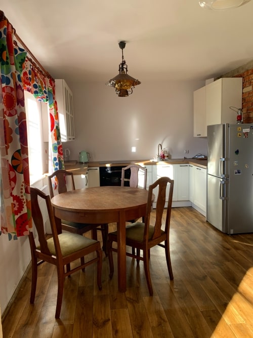 Kuchnia to serce domu. Znajduje się w niej stary piec kaflowy, przy którym można ogrzać się w chłodniejsze wieczory i zagrzać wino. Duży dębowy stół pomieści całą rodzinę lub grupkę znajomych. Dodatkowo w razie większej uczty lub spotkania w większym gronie można go dodatkowo rozłożyć. Siedząc przy stole lub przygotowując posiłki ma się widok na teren przez posesją, gdzie bawią się dzieci w piaskownicy lub huśtają na mini placu zabaw. Zarówno dzieci są na oku jak i gniazdo bocianów, które w okresie wiosenno-letnim są nieocenioną atrakcją. Polecamy wyciągnąć z kredensu lornetkę, która jest na wyposażeniu domku i oglądać te piękne ptaki. W pomieszczeniu znajduje się też dobrze wyposażona kuchnia w zabudowie ze zmywarką, piekarnikiem i wszystkimi potrzebnymi naczyniami.